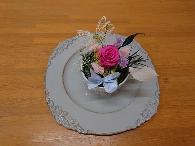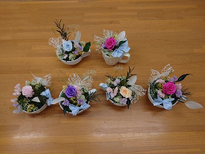 2025年7月1日(火) テーマ:プリザーブドフラワー ~カップにいける~ 花材:バラ、アジサイ3色、カスミソウ、ナズナ、ユーカリ、ルスカス、アイビー、リボン2種 |