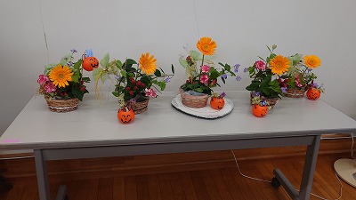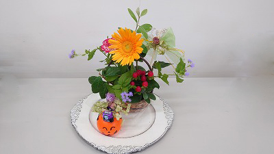 2024年10月1日(火) テーマ:Happy ハロウィン ~秋のお花で楽しみましょう~ 花材:リンドウ、菊、ピペリカム、ハイビスカス、毛糸、ハロウィンバッグ(お菓子入り) |